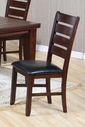 Dimension 18 58W x 22 14D x 40H Finish Dark Oak Black Material Wood Leather Like Set of 2 Dining Chairs with Ladder Back Dark Oak Finish Features black leather like covered cushion seat Ladder back design to complete this beautiful item Great to fit any dining room Add elegance and sty